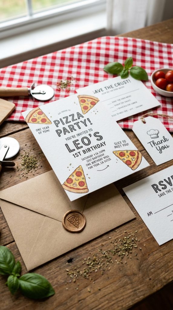 Look for themed stationery that features playful pizza slices, checkered patterns, or tomato sauce splashes. Etsy sellers offer adorable customizable options that won’t break the bank. You can also use Canva to design digital versions if you’re going paperless.