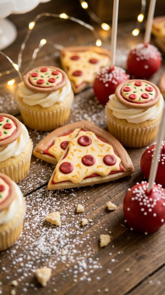 Don’t overlook cake pops either. Dip them in red candy melts, add tiny fondant pepperoni dots, and you’ve got adorable handheld bites guests of all ages will grab immediately. Arrange everything together on a tiered stand for maximum visual impact.