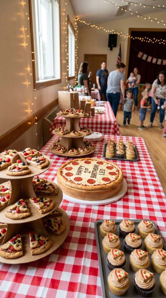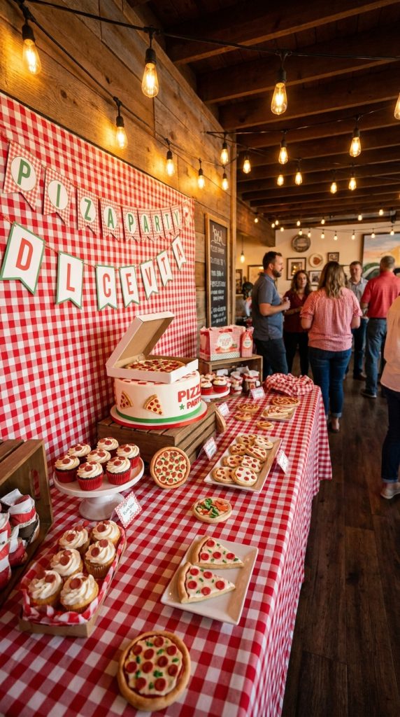 Tuck in some faux pizza slice props between your cookie platters and cupcake towers. Add a banner that reads “Pizza Party” in bold, retro lettering above the table. String some Edison bulbs overhead if you can — they instantly give off that cozy neighborhood pizzeria feel. Every little detail adds up, and your guests will absolutely stop and stare before they even grab a plate.