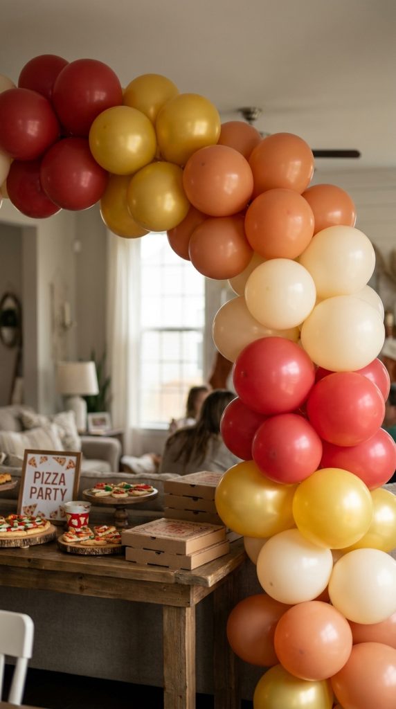 Balloon garlands are a total difference-maker for birthday parties, and the pizza theme makes them even more fun to pull together. Mix red, yellow, and orange balloons to mimic melted cheese and tomato sauce. Add a few white balloons for that stretchy mozzarella effect — trust me, it works brilliantly.