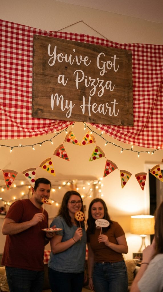 No pizza party is complete without a punny backdrop that makes every photo worth framing. Think phrases like “You’ve Been Loved a Whole Slice,” “One in a Million-aire of Cheese,” or “Baked with Love” displayed on a colorful banner.