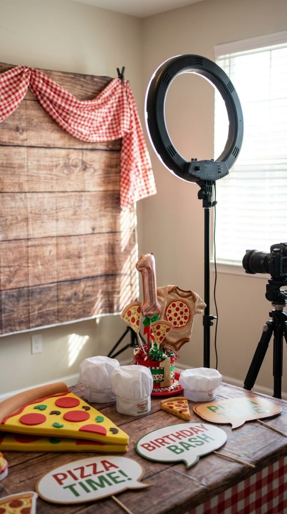 A photo booth takes your pizza backdrop from cute to absolutely unforgettable, and setting one up is easier than you’d think. Grab a ring light, position it facing your backdrop, and you’ve already done the hard part.