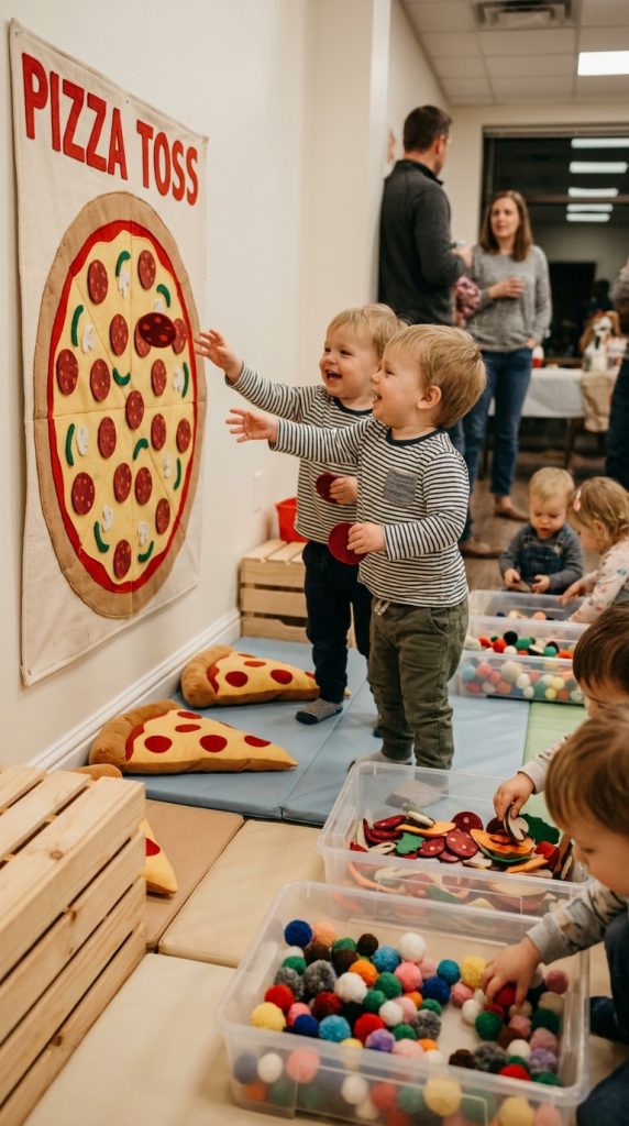 Set up a crawl-through pizza box tunnel or a topping-themed sensory bin filled with soft pom-poms. These activities keep little ones engaged without overwhelming them — which honestly is a win for everyone. Age-appropriate sensory play supports cognitive development in toddlers by encouraging exploration through touch, sight, and sound in a low-stakes environment.