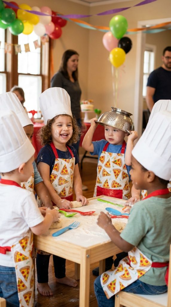 After assembling, have a parent helper transfer the pizzas to a toaster oven nearby. Each child leaves with something they actually made — that’s a birthday win worth celebrating.
