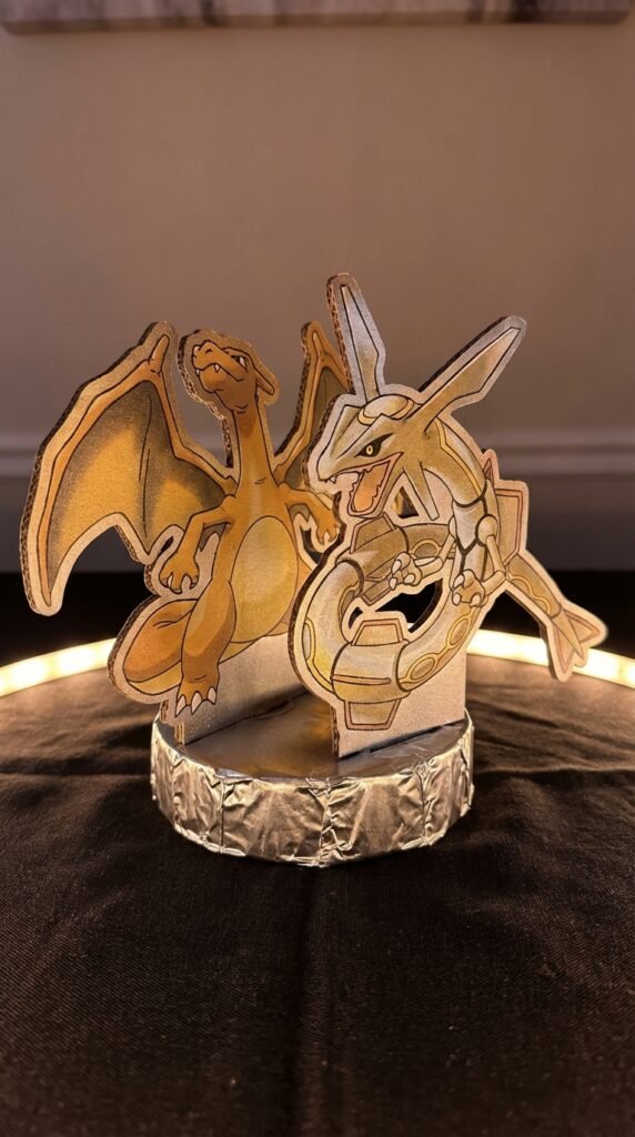 Legendary Pokemon make the perfect statement pieces for your party tables, especially when you give them that eye-catching metallic treatment. You’ll want to create standees of fan favorites like Mewtwo, Lugia, or Rayquaza using heavy cardstock, then spray them with gold, silver, or holographic finishes.