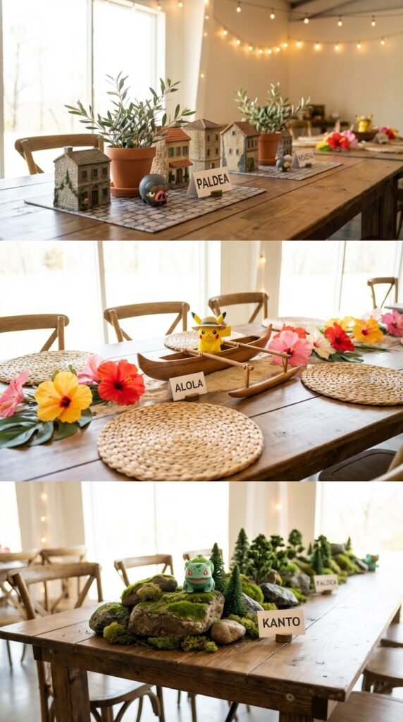 Mix regional starter Pokemon with landscape elements—think tropical blooms for Alola or Spanish-inspired structures for Paldea. Each table becomes its own expedition area, and guests can traverse different realms throughout your party space.