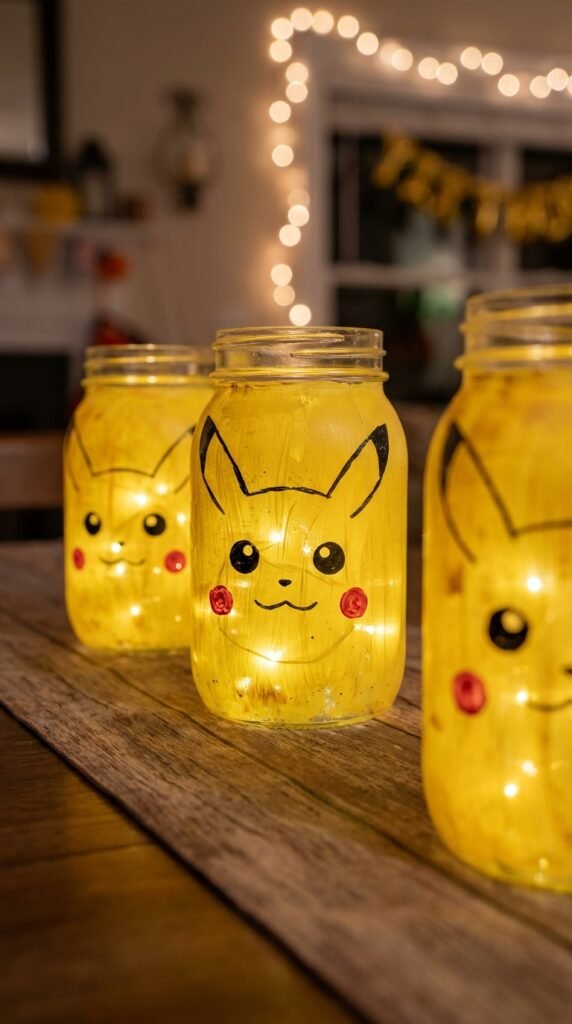 When darkness falls and your Pokemon party shifts into evening mode, these Pikachu mason jar luminaries become absolute showstoppers. You’ll paint mason jars yellow, add Pikachu’s signature features with black and red paint, then drop battery-operated LED lights inside.