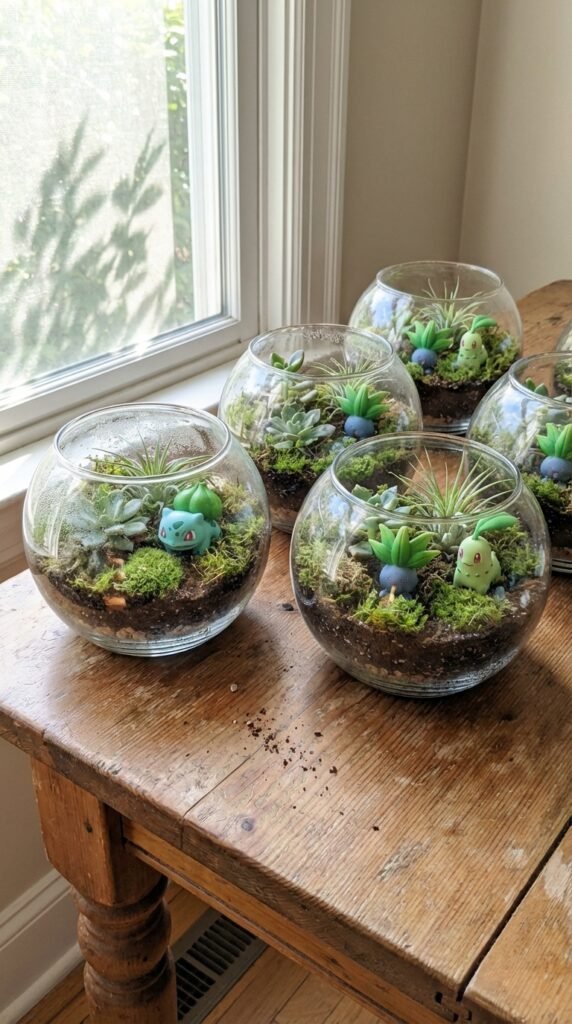 You’ll want to start with simple terrarium designs using small glass containers, moss, and succulents. Place miniature Bulbasaur, Oddish, or Chikorita figures among the greenery for that authentic grass-type habitat feel.