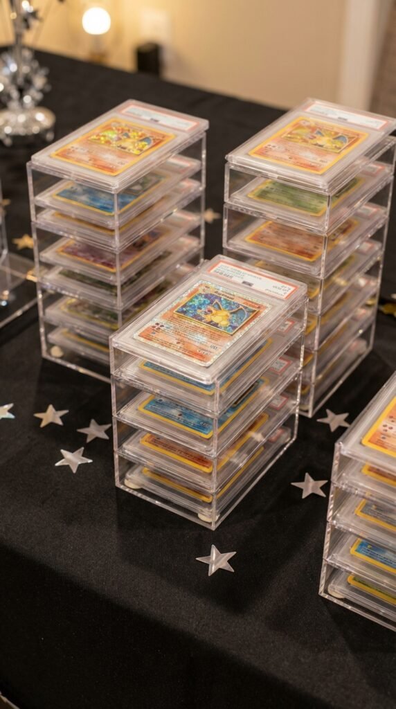 Every collector knows that Pokemon cards are treasure, so why not make them the star of your table? Stack your most prized holographic cards in clear acrylic risers at different heights to catch the light beautifully.