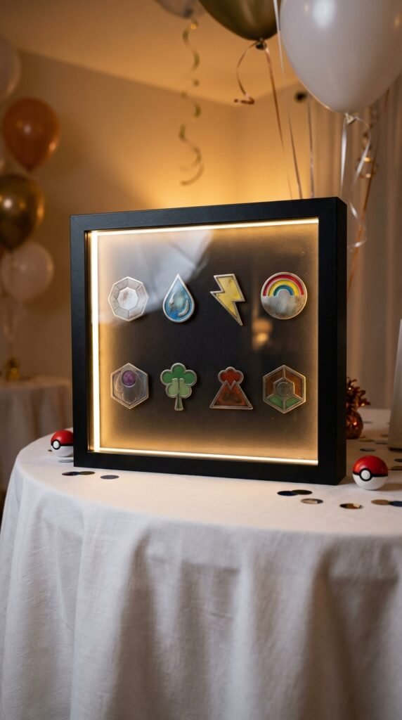 You’ll want to create custom pokemon gym leader badge plaques featuring all eight Kanto badges arranged in a shadow box frame. I’ve found these work brilliantly on round tables where guests can admire them from every angle.