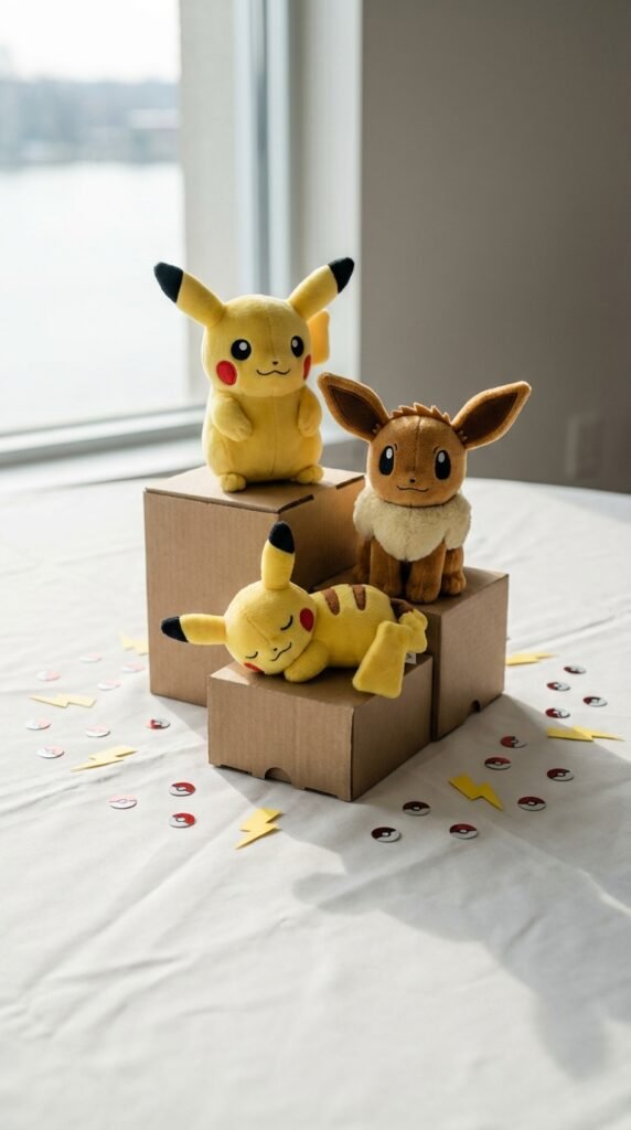 You’ll want to create plush toy groupings with three to five characters per table. I recommend mixing Pikachu with various Eevee evolutions for visual interest. Arrange them at different heights using small boxes or stands underneath.