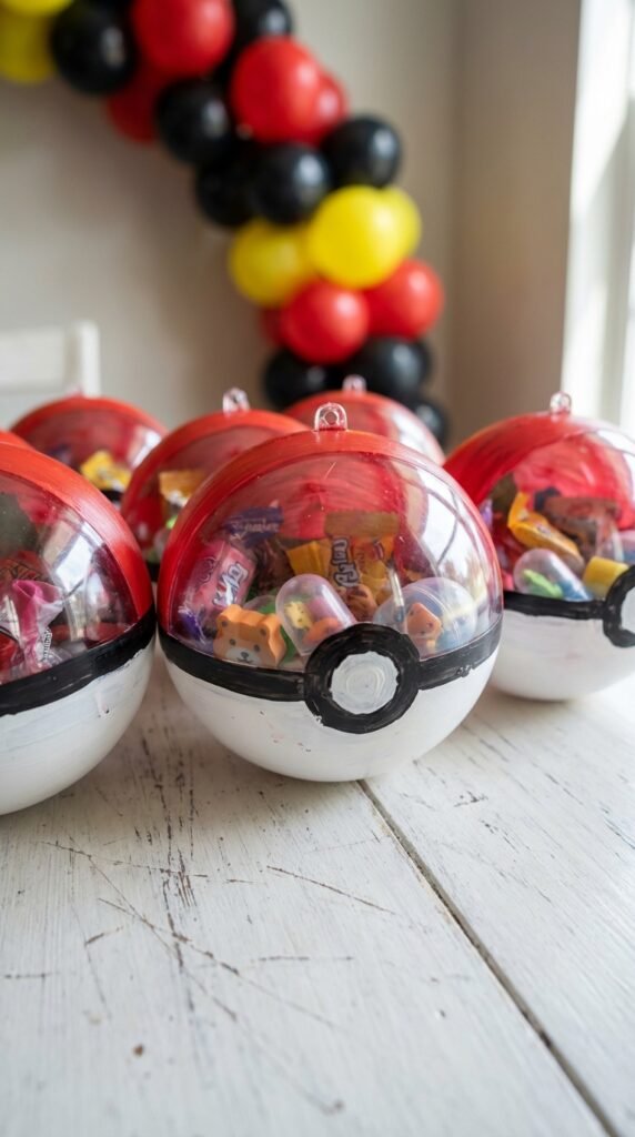 Looking for party favors that’ll make your guests feel like real Pokemon trainers? DIY pokeball containers are perfect for this! You can fill clear or red-and-white ornaments with candy, small toys, and Pokemon cards.