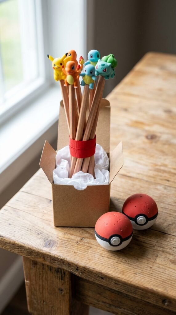 Pokemon-themed pencils and erasers convert mundane school supplies into collectibles your party guests will actually use throughout the school year.