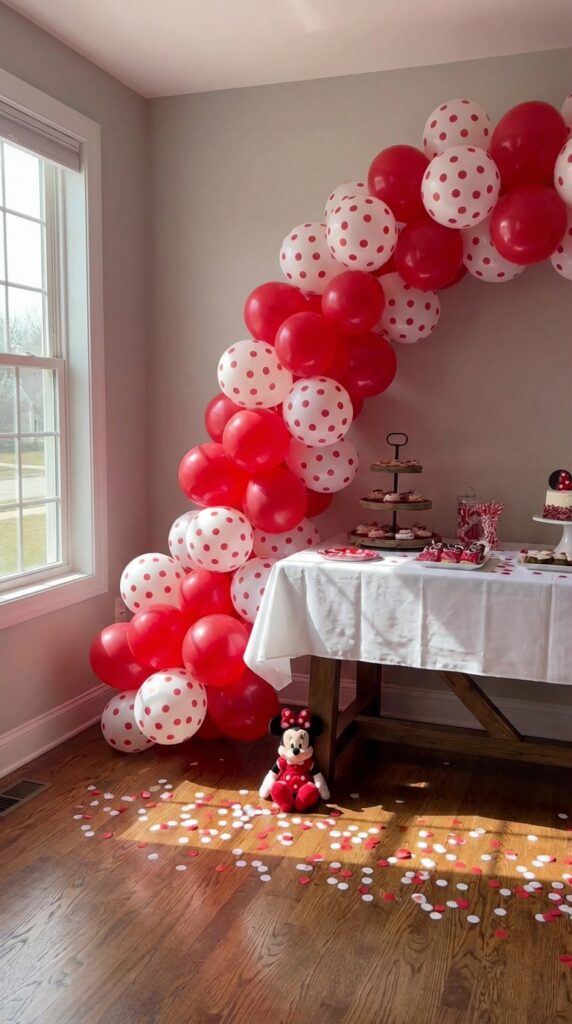 When you’re creating that iconic Minnie Mouse look, nothing makes a bolder statement than a red and white polka dot balloon arch framing your entrance or dessert table. I’ve found that alternating solid red balloons with white ones adorned with red dots creates instant visual impact. The vibrant color contrast catches everyone’s eye the moment they arrive.