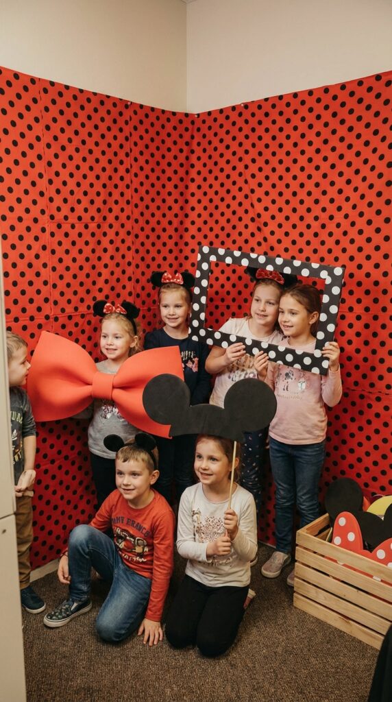 The real magic happens with oversized props for photos—think giant bows, enormous mouse ears on sticks, and jumbo polka dot frames. I’ve found that making props twice the normal size creates hilarious photos kids actually want to share. Include speech bubbles with Minnie’s catchphrases like “Oh, Toodles!” for extra personality.