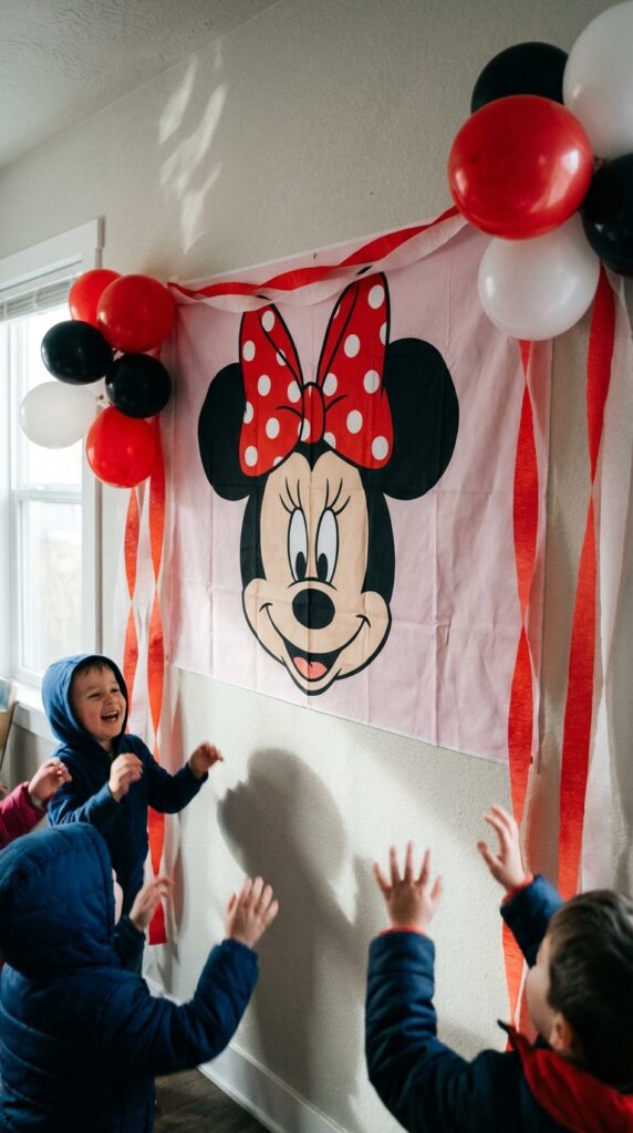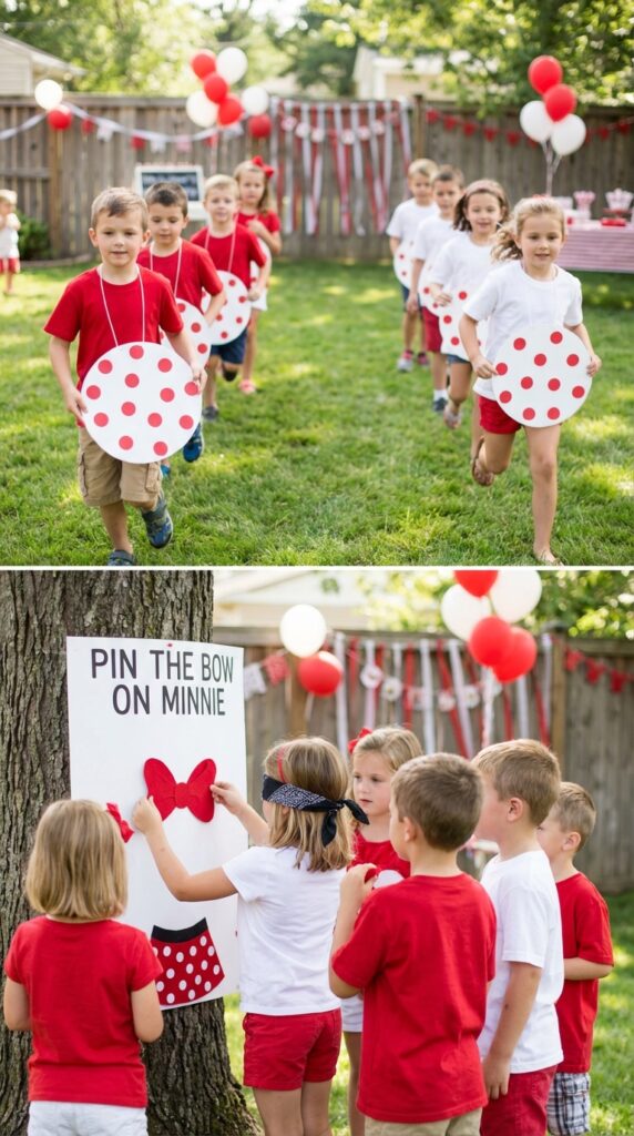 Transform musical chairs into “Pin the Bow on Minnie” using red felt bows and a white poster board backdrop. For competitive Minnie Mouse games, set up a relay race where teams collect oversized polka dots scattered across your yard.