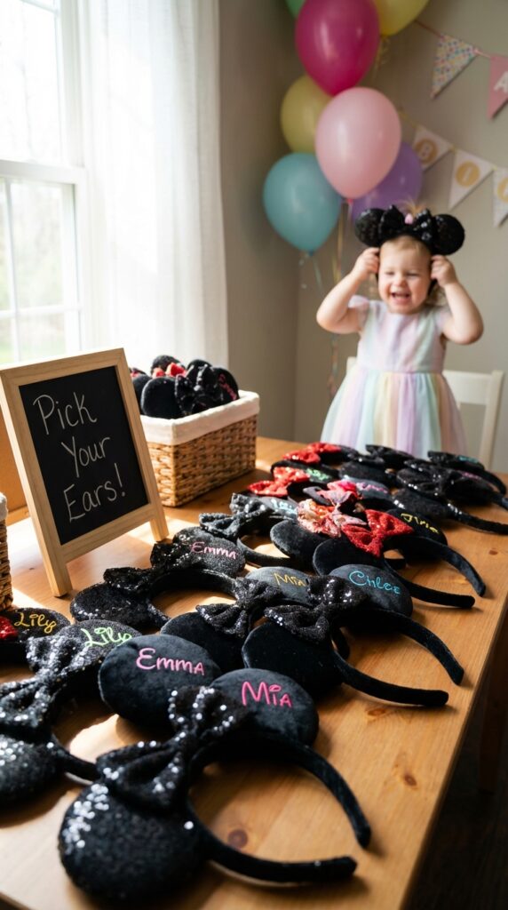 I recommend ordering custom minnie mouse ears with each child’s name embroidered on the back. They’ll instantly know which pair belongs to them, preventing mix-ups during the party.