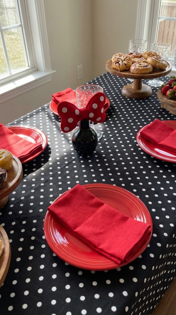 Your dessert table will look stunning, but it’ll feel disconnected if the rest of your party setup doesn’t match that same Minnie energy. That’s where polka dot tablecloths become your secret weapon. I’ve found that black tablecloths with white dots create the perfect base, while red dinnerware pops beautifully against them.