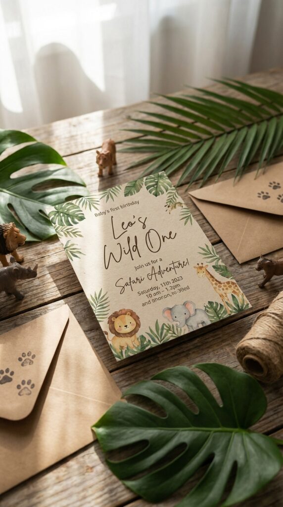Look for jungle-themed invitation designs that coordinate across digital and printed formats to keep your aesthetic consistent.