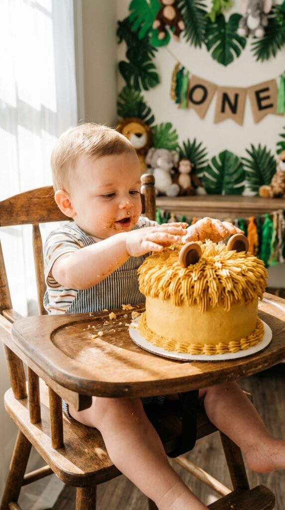 A lion smash cake featuring a golden buttercream mane and fondant ears makes the perfect edible showstopper. Your baby literally destroys a tiny lion — it’s adorably chaotic.