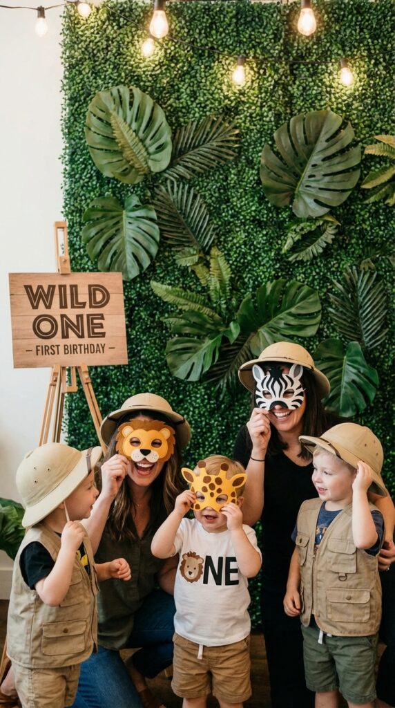 Behind every great safari party is a photo booth that turns guests into jungle explorers for a few magical minutes. Set up a simple backdrop using faux greenery, and scatter wildlife masks shaped like lions, zebras, and giraffes nearby.