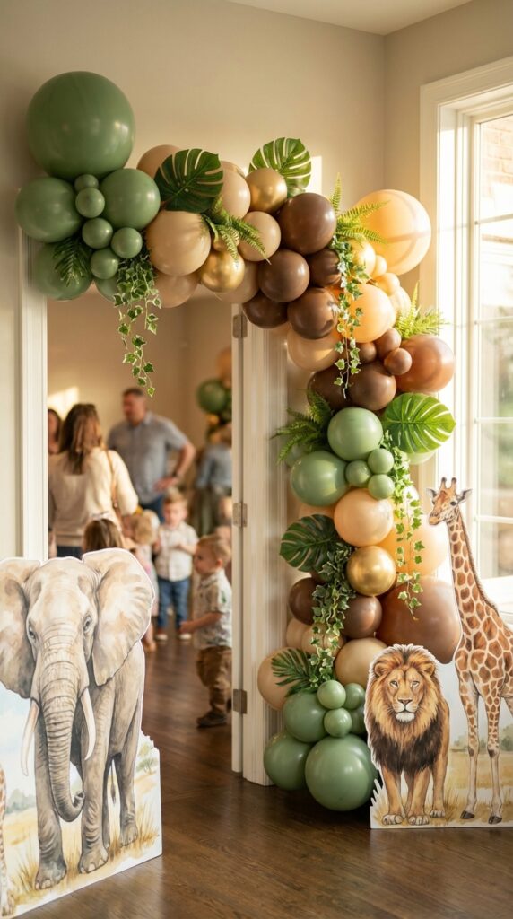 A jungle balloon arch in earthy greens, browns, and golds instantly changes your entrance.