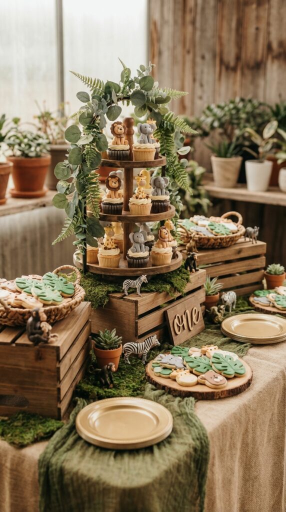 The dessert table is honestly the heart of any first birthday party — and a safari theme gives you so much to work with. Arrange safari cupcakes topped with fondant lions, giraffes, and elephants as your centerpiece.