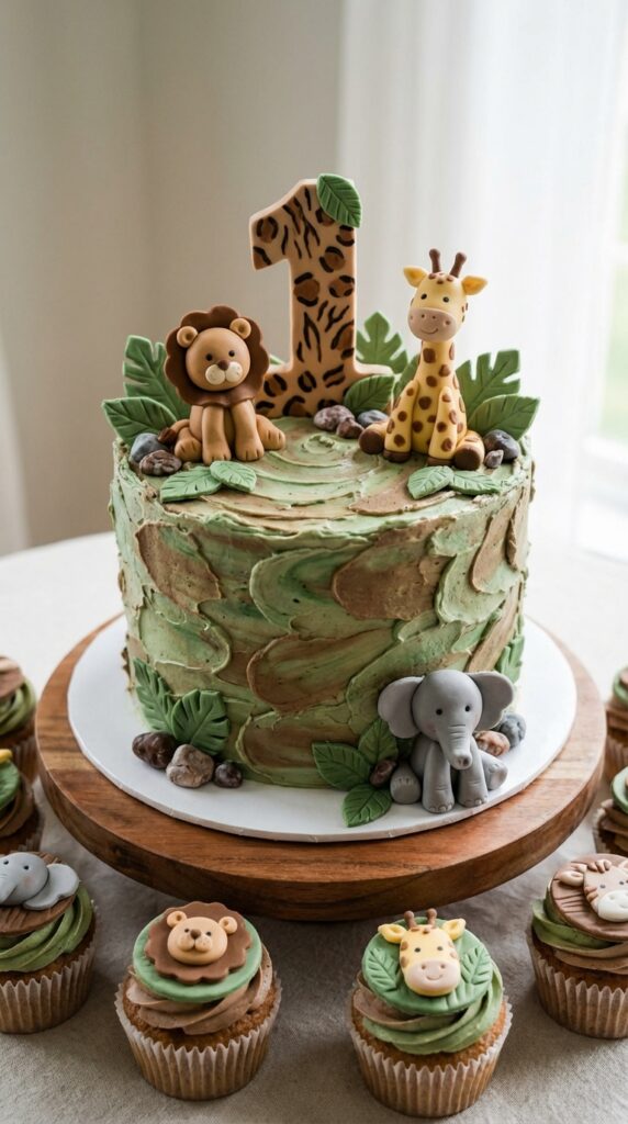 For frosting designs, think textured buttercream in earthy greens and browns, topped with fondant lions, giraffes, or a sculpted “1” surrounded by palm leaves.