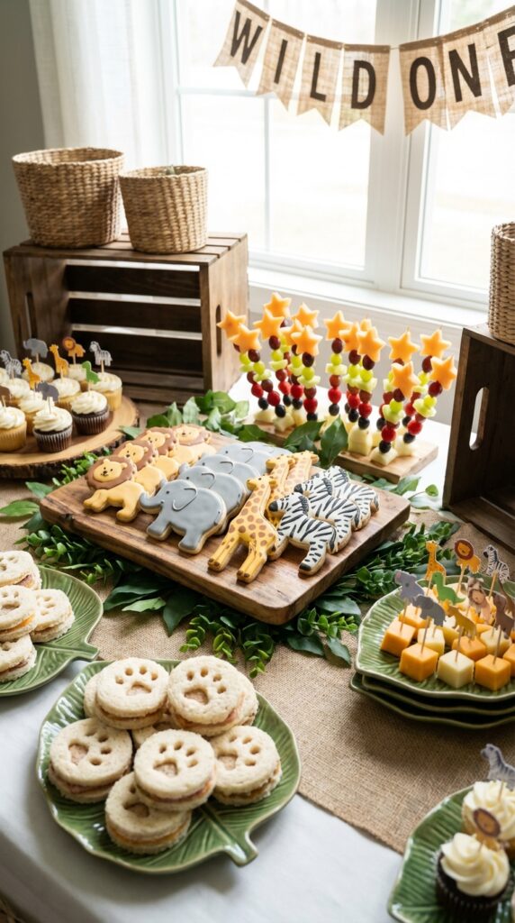 Beyond the birthday cake, your snack table is where creativity really gets to roam wild. Think animal cookies arranged in little “safari herds,” fruit skewers shaped like colorful jungle scenes, and bite-sized sandwiches cut into paw prints or lion faces.