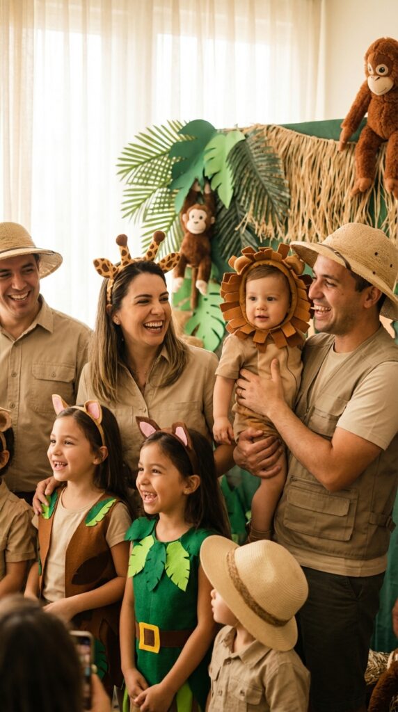 For guests who want to go further, suggest simple jungle outfits like khaki shorts, green tees, or animal-print accessories.