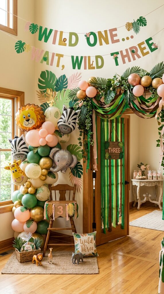 Don’t forget a “Wild One… Wait, Wild THREE” banner for the birthday milestone. For a girl’s celebration, charming adventurous safari inspirations can help you pull together a cohesive feminine theme with touches like blush pink and gold accents woven into the jungle decor. Layer these elements together, and your living room changes into a genuine safari basecamp. Simple pieces, big visual impact.