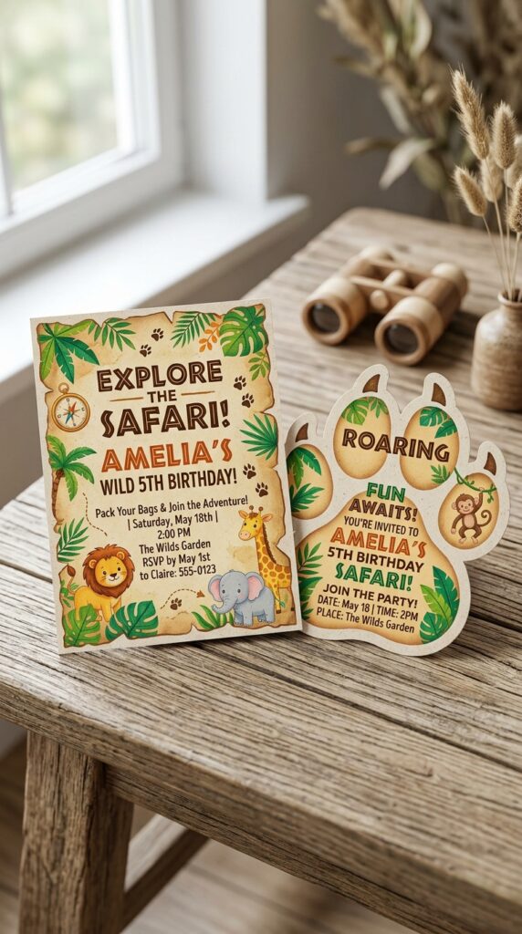 For a truly memorable first impression, explore safari invitation designs that feature jungle animals, tropical foliage, and adventurous typography to set the tone before the party even begins.
