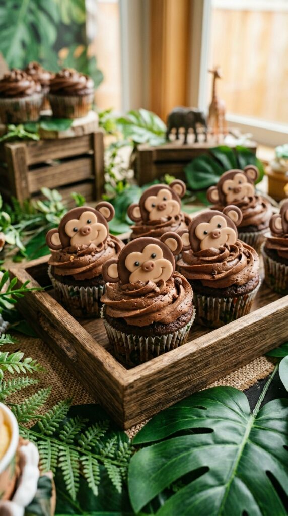 Monkey cupcakes might just steal the whole safari spread, and they’re surprisingly fun to make. Start with rich chocolate frosting as your base — that’s your chocolate surprise right there.