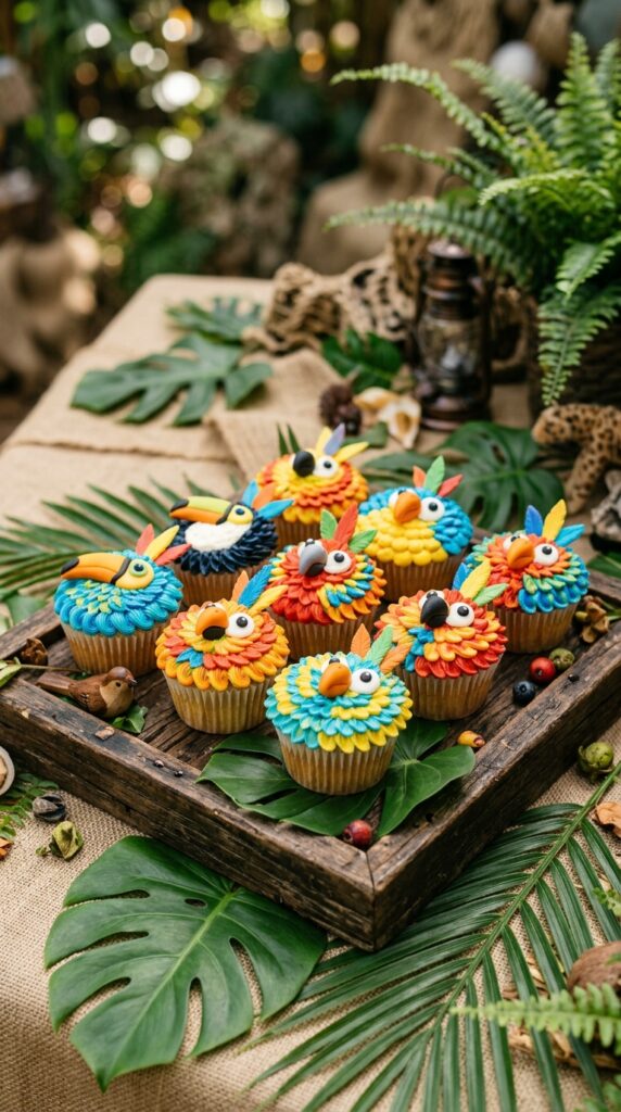 Top each cupcake with fondant beaks and candy eyes to create adorable parrot faces. You can also build tiny bird nests using shredded coconut dyed brown, then tuck a small fondant egg inside. It’s a sweet detail that kids absolutely love spotting. These colorful treats balance the earthy tones from your crocodile cupcakes perfectly. For an even more immersive display, pair your cupcake platter with animal figurines and greenery arranged as a safari-themed table centerpiece to tie the whole spread together.