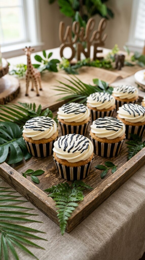 You’ll get that wild, striking look without much effort. These cupcakes always surprise people because they look far more impressive than the skill they actually require. They also fit beautifully into a broader safari-themed first birthday celebration built around a “Wild One” concept.