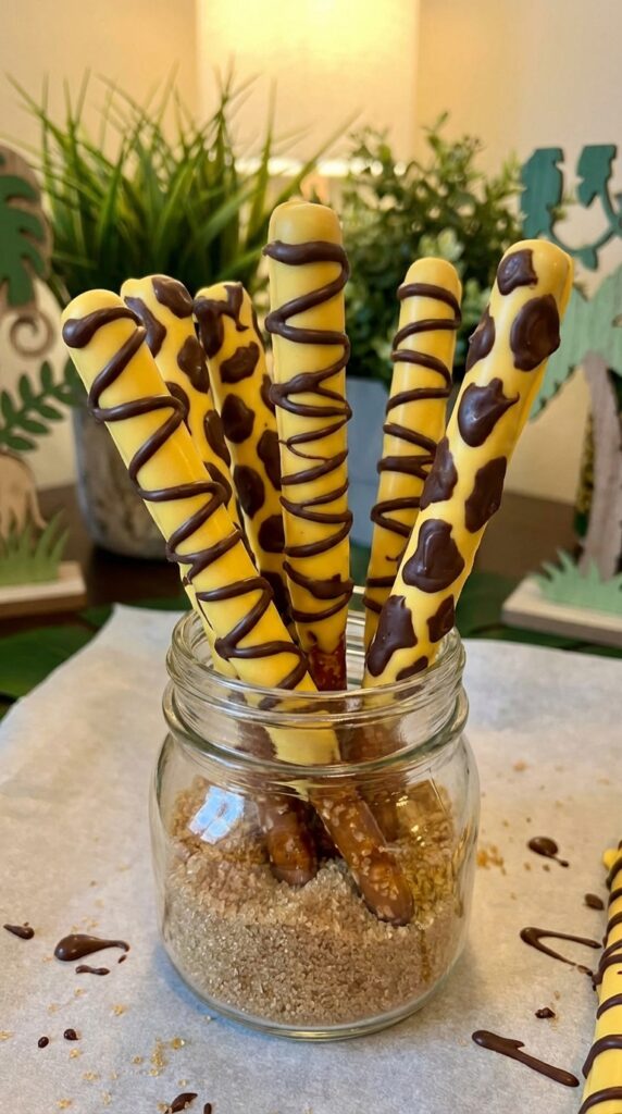 Once the drinks are poured and the lemonade station is humming, it’s time to bring in a snack that looks almost too good to eat. Giraffe pretzel rods are exactly that.