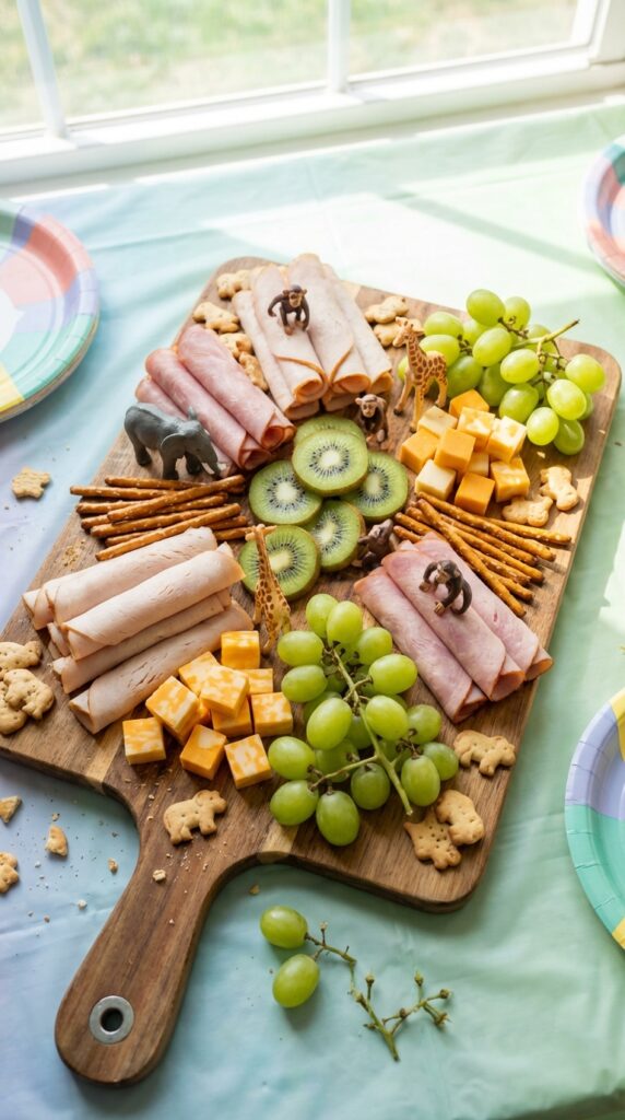 A jungle charcuterie board might just be the smartest move you make for this party. It fits the jungle theme perfectly and keeps kids happily grazing without you managing a sit-down meal.