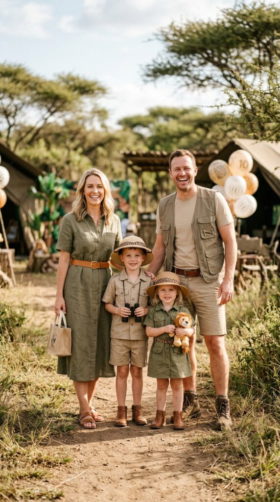 When the whole family shows up in matching safari outfits, the photo opportunities alone make it worth the effort. Family coordination doesn’t mean identical outfits — it means everyone wearing complementary khaki, olive, and brown tones together.