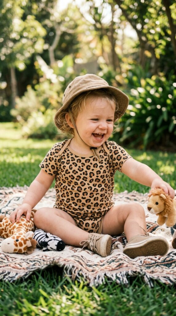 Coordinate the outfit with neutral tan shoes and a tiny canvas hat for a complete look. Your little one will honestly look like the cutest animal voyager at the party. These looks are especially popular for safari-themed first birthdays, where the “Wild One” celebration theme pairs perfectly with bold animal prints.