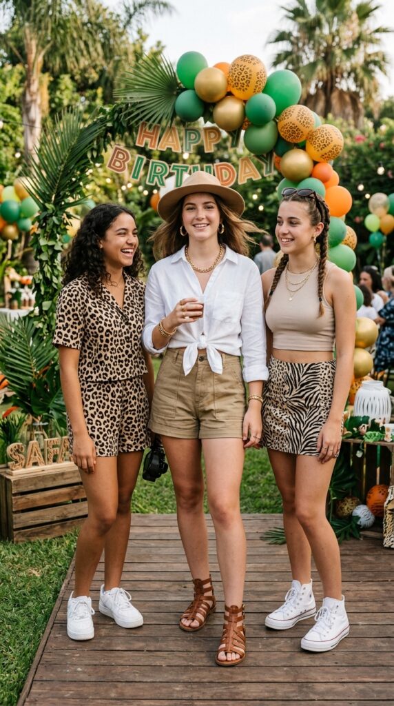 Teen girls honestly have the most fun with safari birthday party outfits because they can pull off looks that are both stylish and theme-appropriate. Think high-waisted khaki shorts paired with a knotted white linen blouse — seriously cute and effortless.