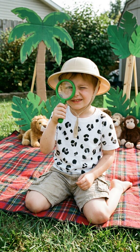 Pulling together a safari birthday party outfit doesn’t have to drain your wallet. Thrift store finds are your best friend here — grab khaki pants, a button-down shirt, or even a tan vest for just a few dollars.