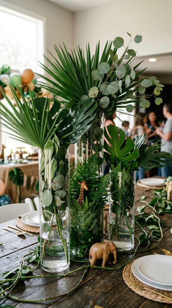 Jungle greenery centerpieces are honestly one of the easiest ways to anchor your safari birthday party’s whole vibe. Grab some tall glass vases and stuff them with wild foliage like eucalyptus, palm leaves, and ferns. It’s surprisingly affordable and looks incredibly lush.