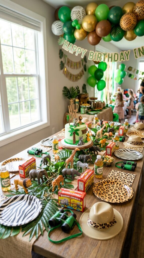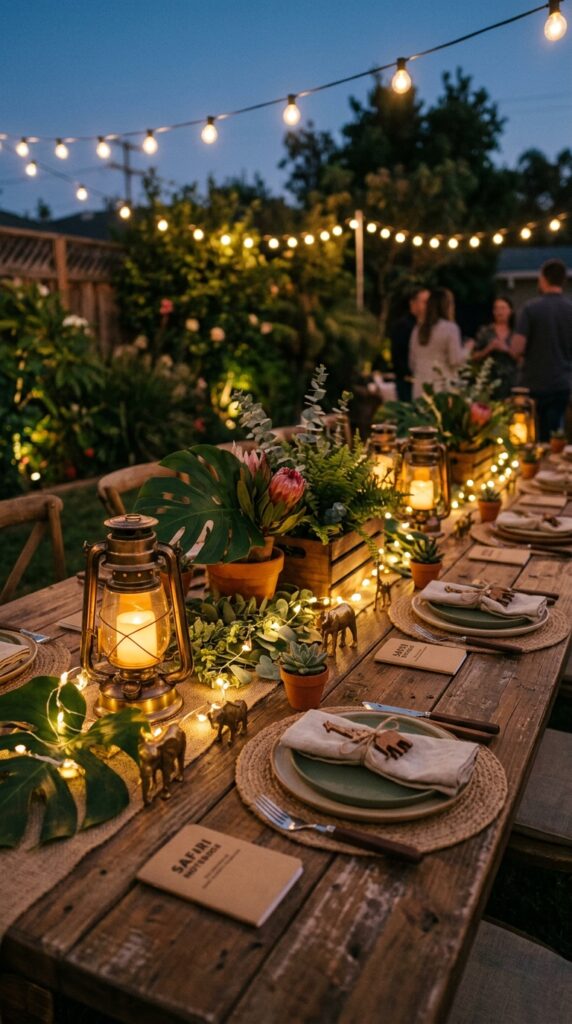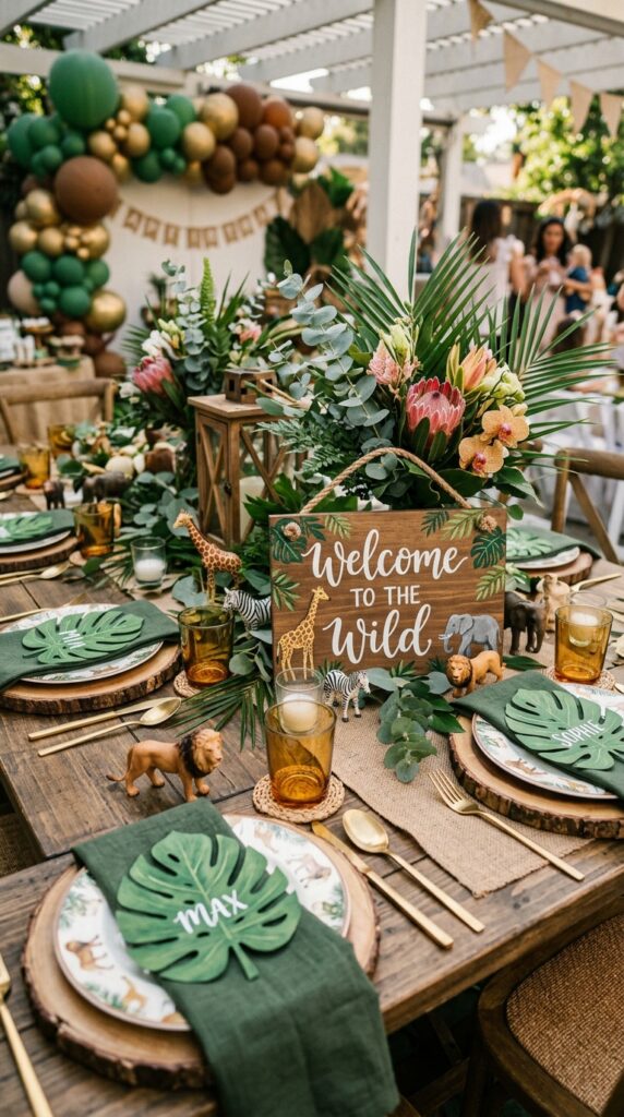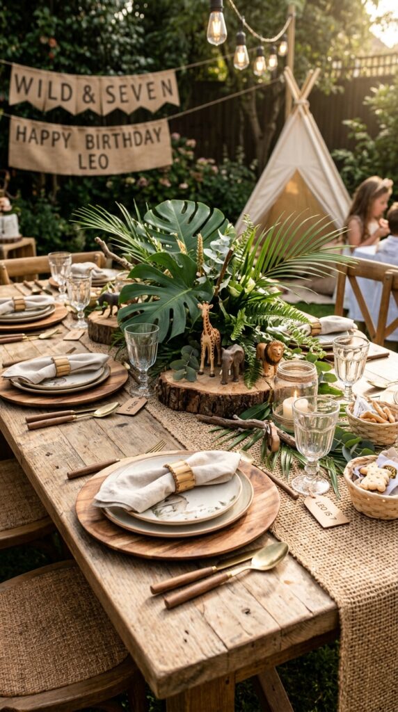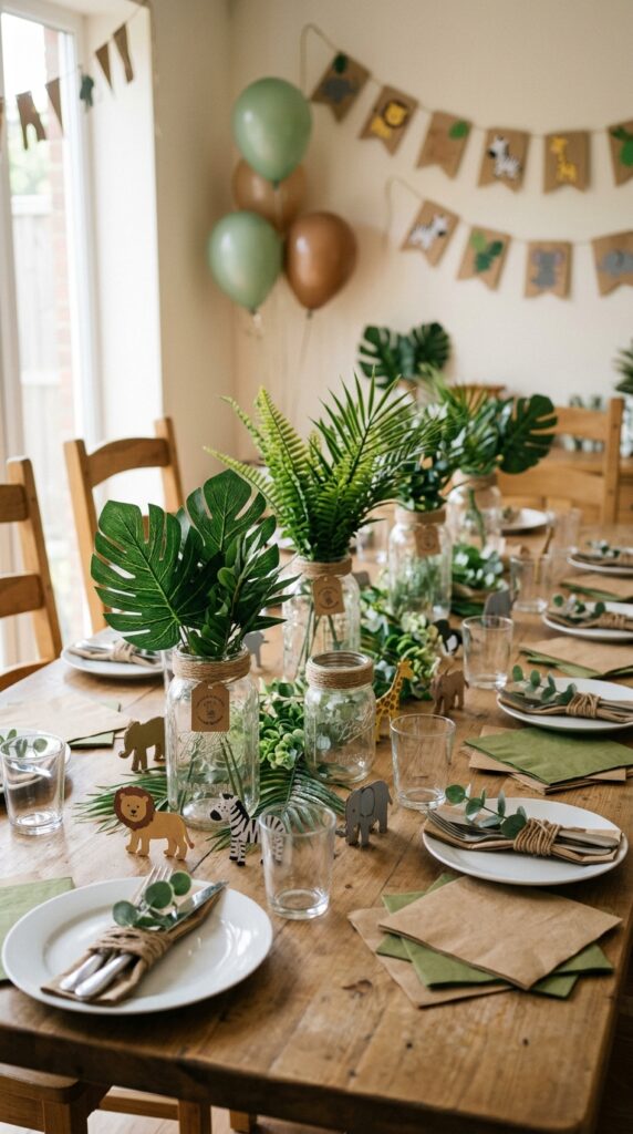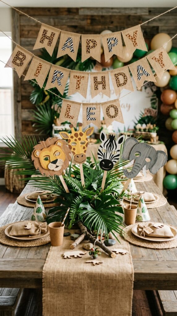 Try crafting DIY safari banners using burlap, twine, and animal print letters — they’re surprisingly simple and look polished hanging above your table.
