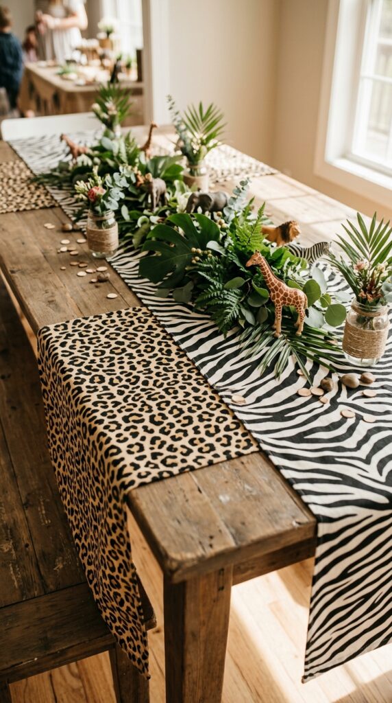 Layer two runners crosswise for a fuller look — it’s a simple trick that photographs beautifully. Avoid overly shiny fabrics since they cheapen the aesthetic fast. Matte finishes always win here. For a girl’s safari celebration, pairing animal print runners with earthy floral accents creates a tablescape that feels both adventurous and elegantly feminine.