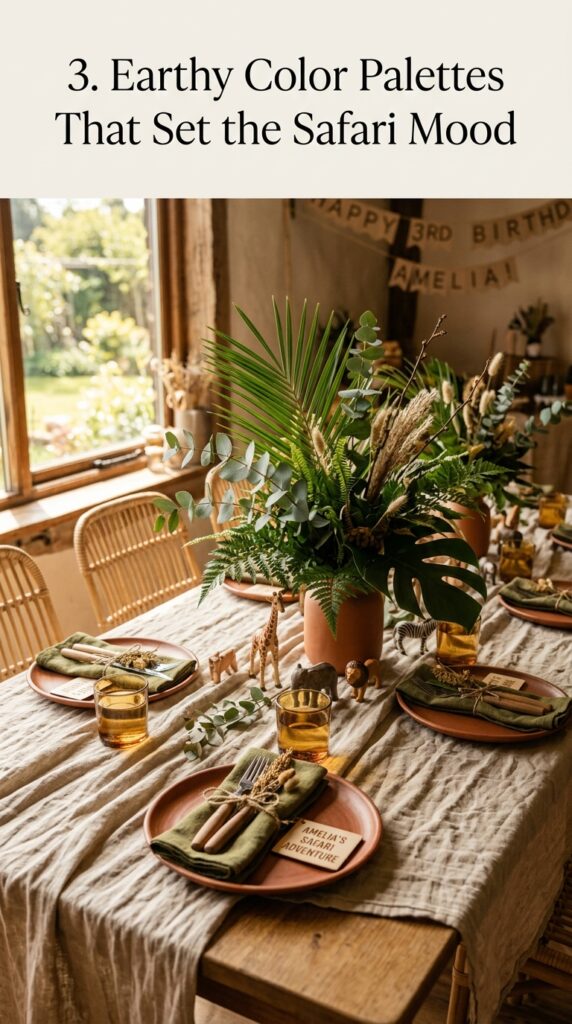 Nothing sets a safari mood faster than nailing your color palette. Think sandy beige, warm terracotta, deep olive green, and rich chocolate brown. These earthy tones instantly transport your guests to the African savanna — no passport required.