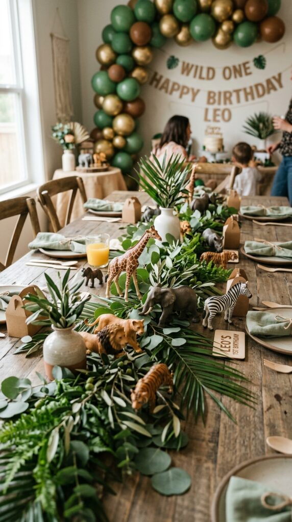For toddler-friendly tables, softer versions of these hues work beautifully since gentle jungle decor tends to feel less overwhelming and more inviting for little ones.