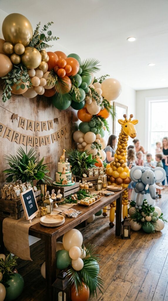 Balloons can convert a plain party space into something that actually feels alive, and for a safari theme, your color palette does most of the heavy lifting.