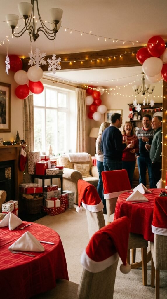 Don’t forget white string lights—they’ll make everything glow warmly. Red and white balloons clustered in corners complete this cheerful, cozy atmosphere perfectly.