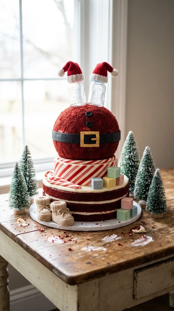 Consider tiered cakes with alternating Christmas and baby elements—candy cane stripes on one layer, pastel baby blocks on another. Winter wonderland themes work beautifully too, with white buttercream “snow” and miniature Christmas trees surrounding edible baby booties.