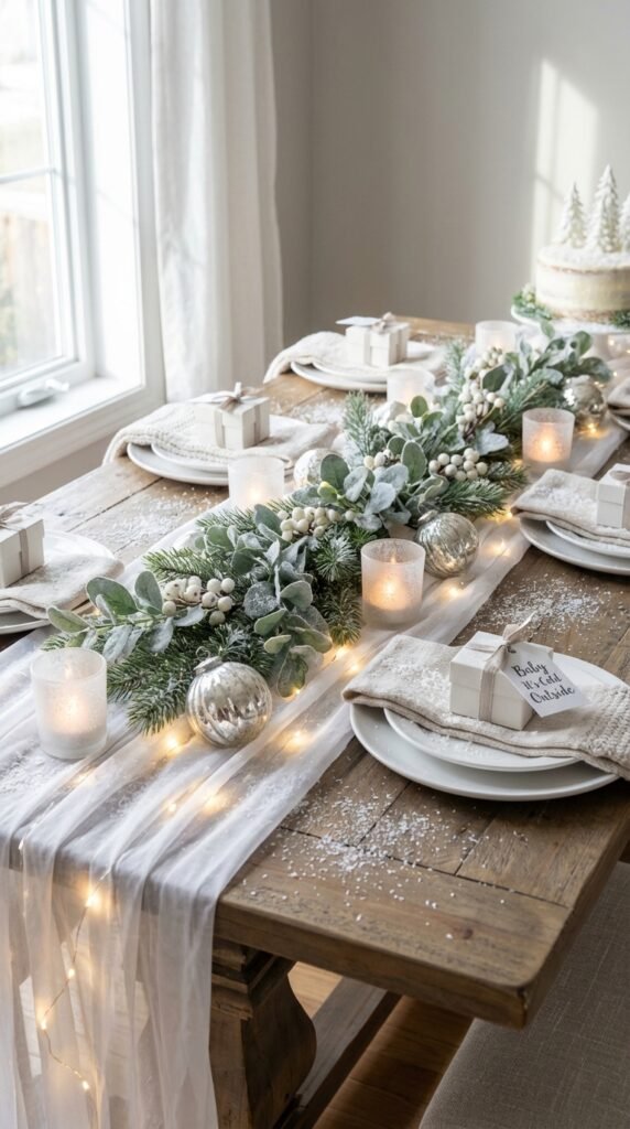 Finally, layer in white and silver elements: frosted votives, mercury glass ornaments, and artificial snow scattered strategically. Trust me, this combination alters any ordinary table into pure winter magic.